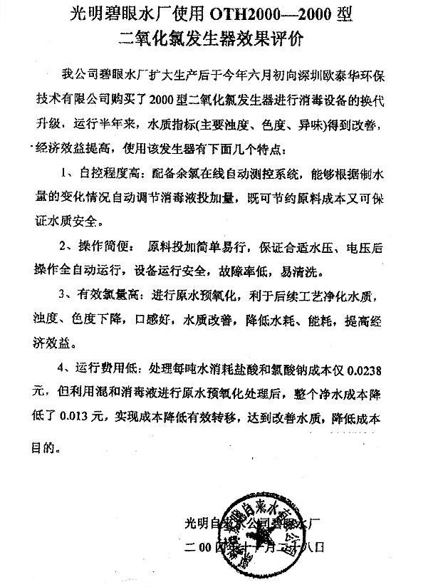 光明自來水公司碧眼水廠-歐泰華二氧化氯發生器效果評價