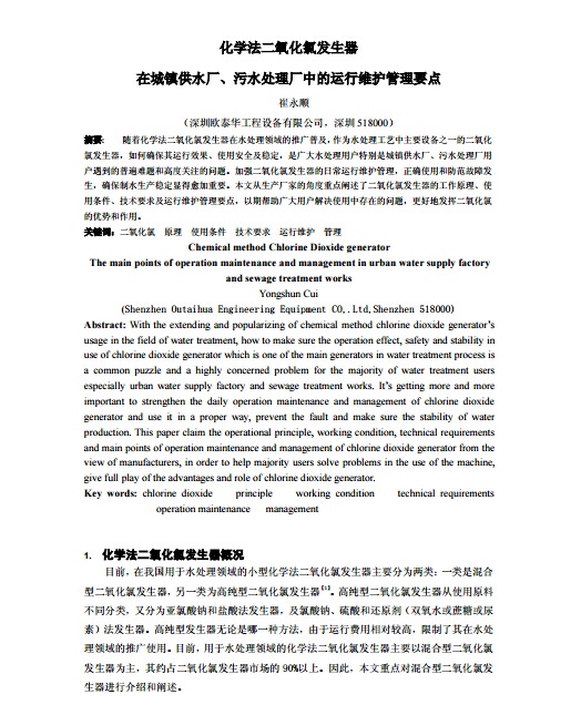 化學(xué)法二氧化氯發(fā)生器 在城鎮(zhèn)供水廠、污水處理廠中的運(yùn)行維護(hù)管理要點(diǎn)