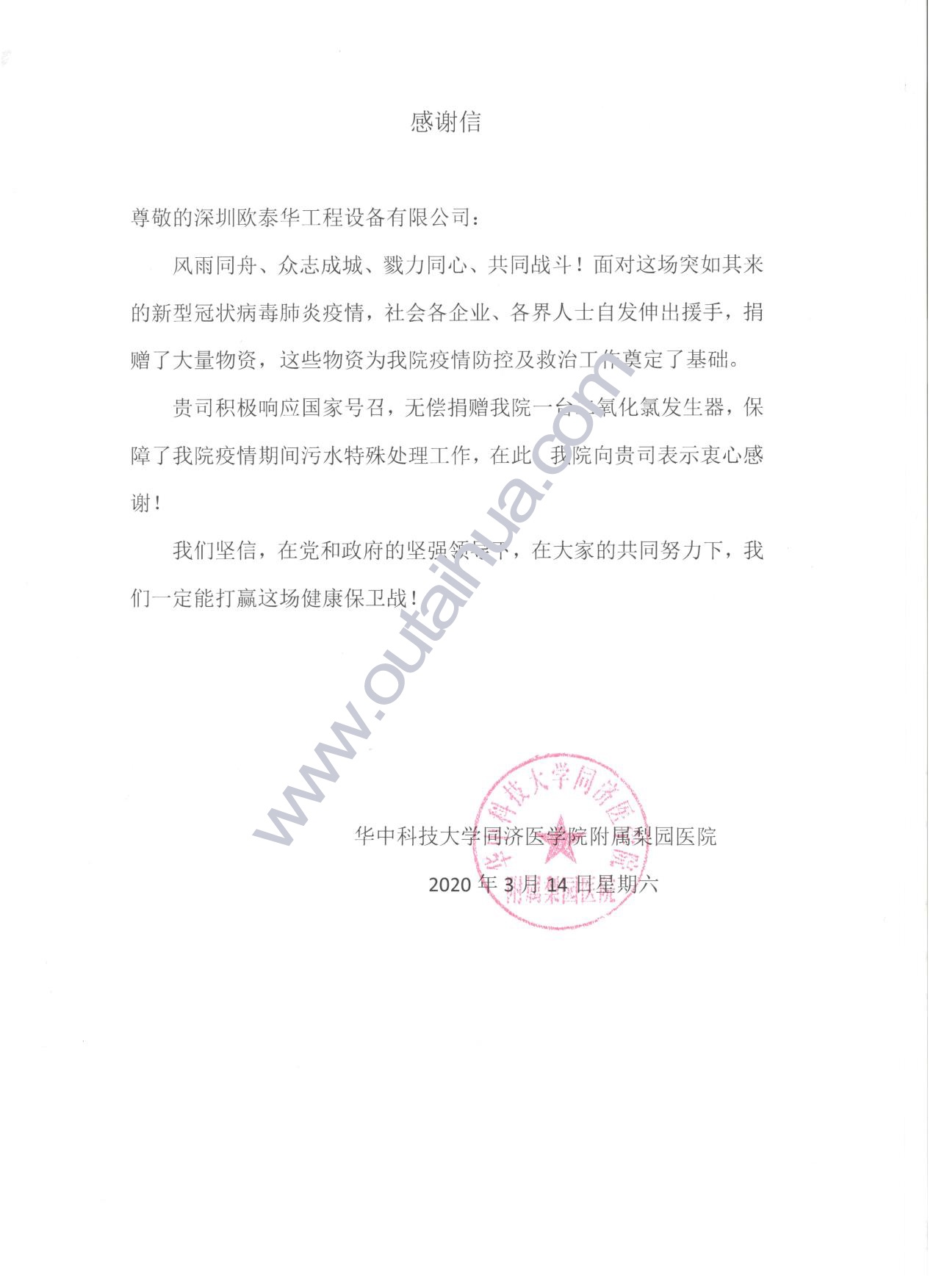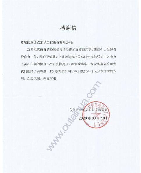 截止今日,歐泰華向全國客戶捐贈價值10萬元的防疫消毒設備。歐泰華老用戶們紛紛致電表示感謝。廣東連南自來水公司致電表示:“感謝你們的無私幫助,你們守護了我們的安全”。武漢華中科技大學同濟醫學院附屬梨園醫院在感謝信中提到,“貴司積極響應國家號召,無償捐贈我院一臺二氧化氯發生器,保障了我院疫情期間污水特殊處理工作。”