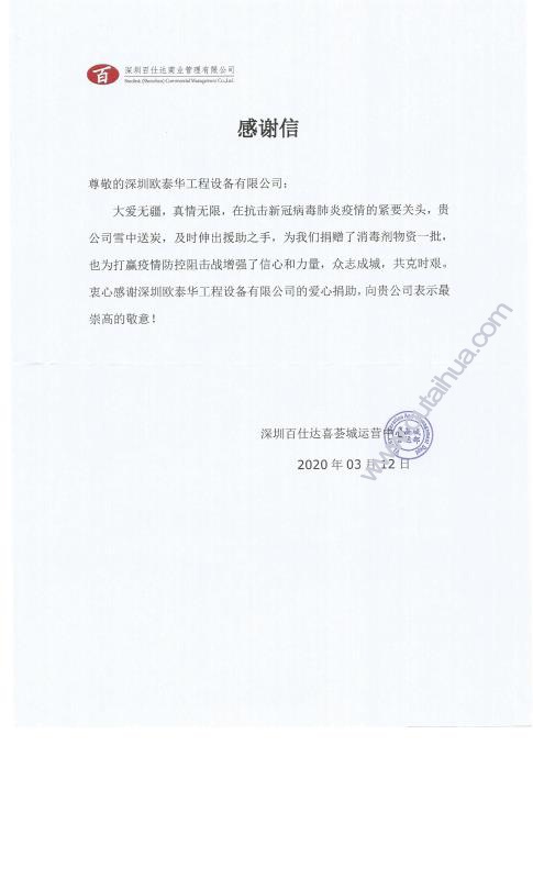 深圳歐泰華工程設備有限公司作為二十多年的消毒設備生產企業,在新型冠狀病毒肺炎疫情危難時刻,無償向湖北地區及深圳周邊社區、工業區、商場等單位捐贈二氧化氯發生器和次氯酸鈉消毒液,為全國廣大客戶提供專業防疫指導;助力打贏這場疫情防控阻擊戰。