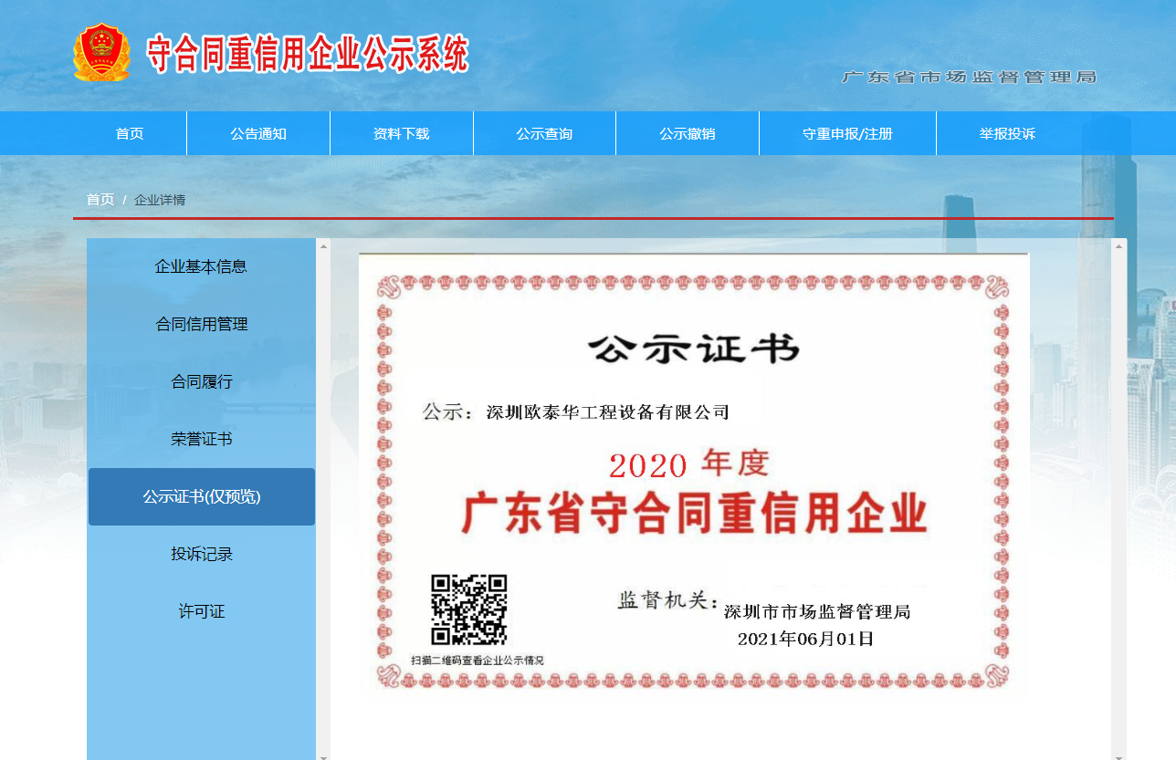 深圳歐泰華榮獲2020年度“廣東省守合同重信用企業”,該項榮譽的公示評選活動是廣東省市場監督管理局核準的一項高規格企業評選,評定標準嚴格,旨在推進企業誠信建設,增強企業社會責任,提升企業公信力等。此獎項已成為廣東省企業信用系建設的重要組成部分,也是市場監管部門對環保企業高度認可的標志。