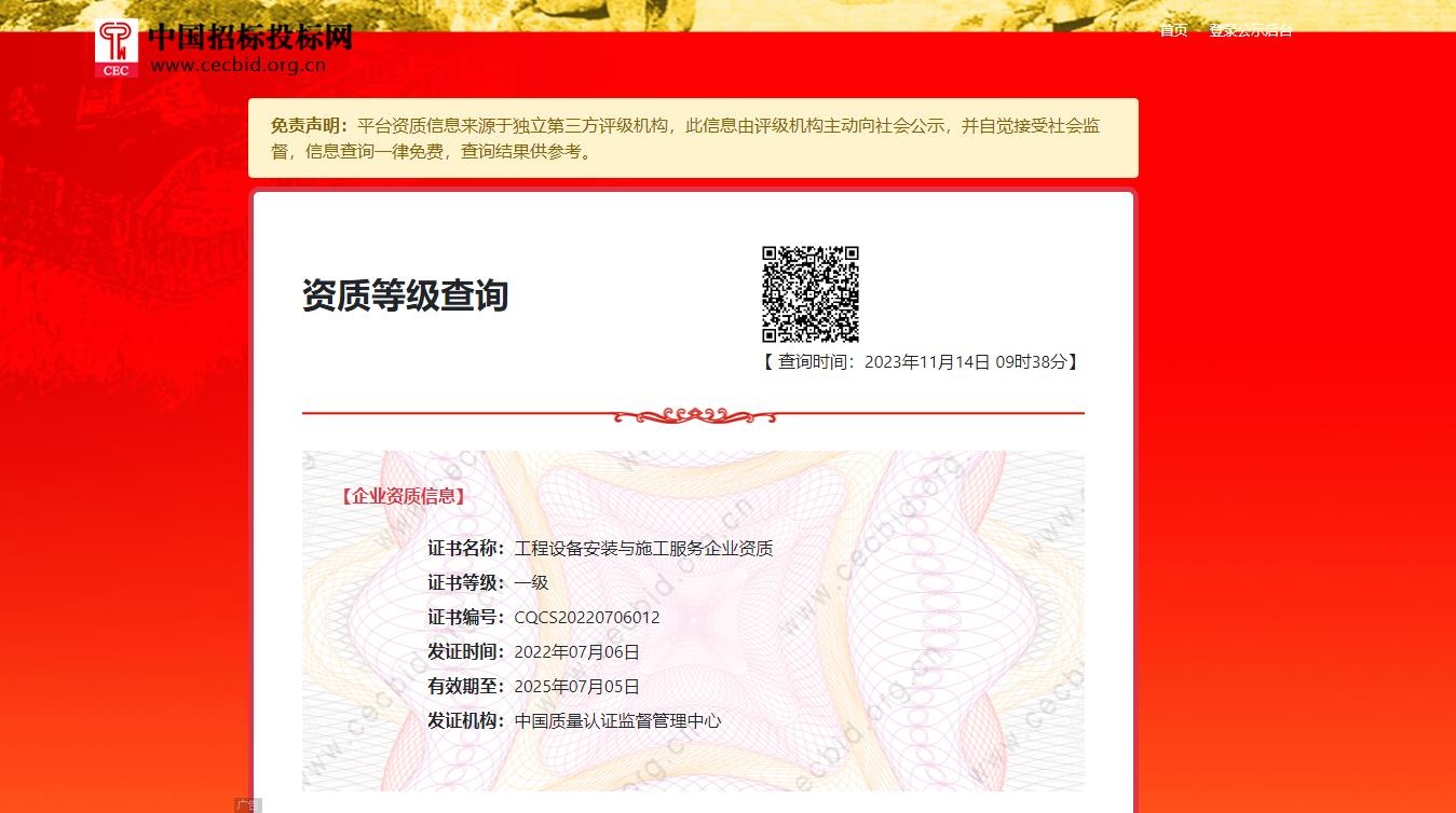 經(jīng)中國質(zhì)量認證監(jiān)督中心審核、評定,歐泰華順利通過《工程設(shè)備安裝與施工服務(wù)企業(yè)資質(zhì)》一級證書的年審工作,證書權(quán)威可查(www.cecbid.org.cn)。