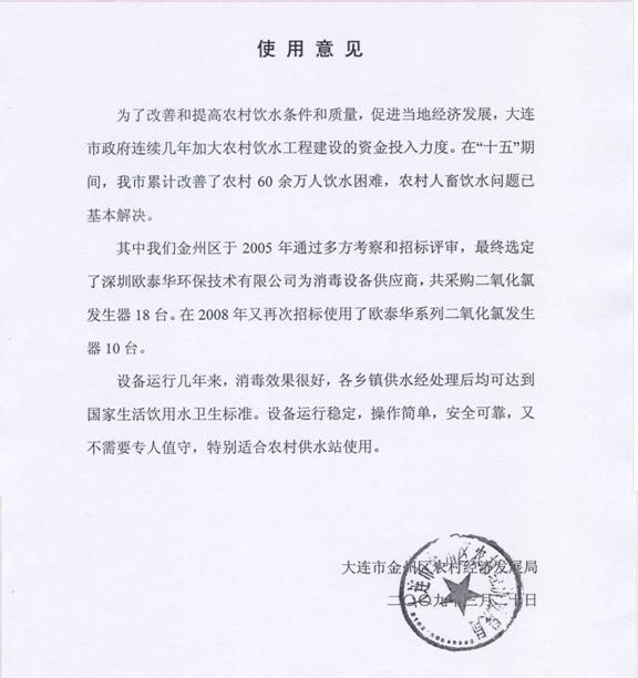 大連金州區2008飲水安全工程使用意見