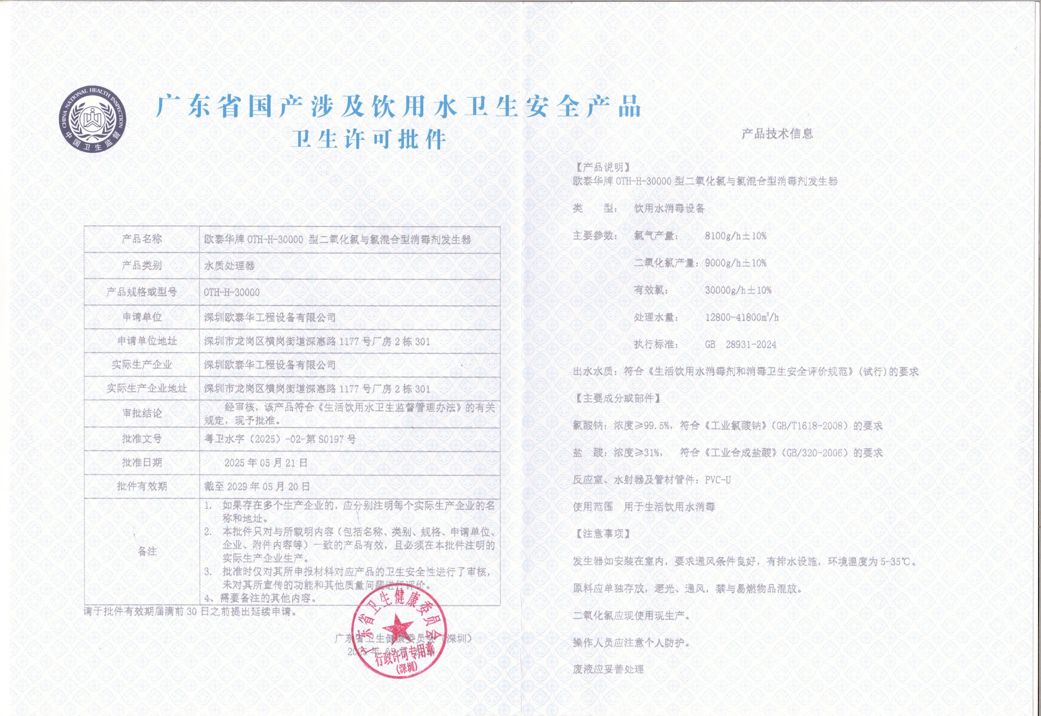 深圳歐泰華的核心產品——二氧化氯與氯混合消毒劑發生器,近期順利完成涉水衛生許可批件更新,實力再獲官方蓋章!