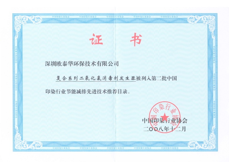 2008年12月4日全國印染行業(yè)年會上。我公司光榮入選“第二批中國印染行業(yè)節(jié)能減排先進(jìn)技術(shù)推薦目錄”,是印染行業(yè)對我產(chǎn)品的認(rèn)可。2000年我公司產(chǎn)品第一次進(jìn)入印染行業(yè)中,應(yīng)用于廣東省開平(香港潤成)整染廠,用于印染廢水的脫色去臭。2008年,廣東溢達(dá)紡織有限公司二氧化氯發(fā)生器共9臺。2008年8月11日經(jīng)廣東省疾病預(yù)防控制中心檢驗全部達(dá)到GB/T20621-2006《化學(xué)法復(fù)合二氧化氯發(fā)生器》規(guī)定的有效氯產(chǎn)率。