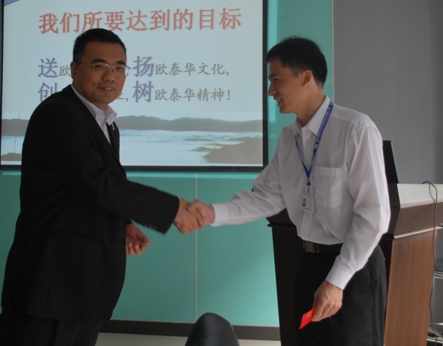 他為了“大家”的團聚,貢獻自己的“小家”,這種敬業精神值得我們每一個人學習。凡是歐泰華的員工,不論資歷深淺,不論職位高低,不論從事何種工作,我們的一言一行,一舉一動,都與歐泰華的形象聯系在一起。只有成就了大家,成就了員工,成就了客戶,才能最終成就自己,因為我們歐泰華的理念就是“真心凝聚服務,利他創造共贏”。鑒于胡小芽的優異表現,總經理給予其特別獎勵500元,并由總經理崔永順先生親自頒獎以資鼓勵!我們為歐泰華有這樣以企業為家的員工而感動,也為歐泰華有這樣心系員工的領導感到驕傲和自豪!